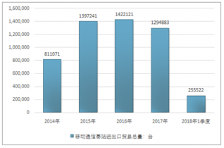 2016年我國移動通信基站進出口貿易總量1422121臺,2017年進出口貿易總量1294883臺;2018年1季度進出口貿易總量255522臺。