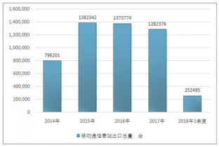2016年我國移動通信基站出口總量1373774臺,2017年出口總量1282376臺;2018年1季度出口總量252495臺。