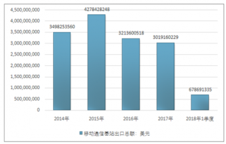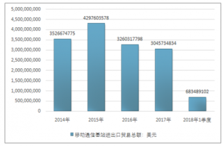 2016年我國移動通信基站進出口貿易總額3260317798美元,2017年進出口貿易總額3045734834美元;2018年1季度進出口貿易總額683489102美元。