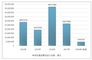2016年我國移動通信基站進口總額46717280美元,2017年進口總額26574605美元;2018年1季度進口總額4797767美元。
