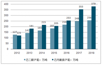 2012-2018年中國(guó)己二酸產(chǎn)能與己內(nèi)酰胺產(chǎn)能統(tǒng)計(jì)