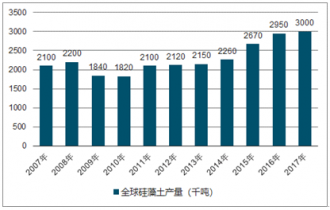 硅藻土在化妝品、人造皮革、動物飼料、助濾劑、建筑材料等領域應用廣泛,近年來發(fā)展態(tài)勢良好,全球硅藻土產量持續(xù)增長,根據(jù)數(shù)據(jù)統(tǒng)計顯示,2017年全球硅藻土產量達300萬噸。