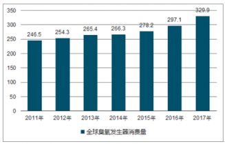 在下游工業的拉動及新興市場不斷增長的推動下,全球臭氧發生器市場消費向好,2017年全球臭氧發生器消費量為329.9萬臺,較2016年的297.1萬套增長11.03%。