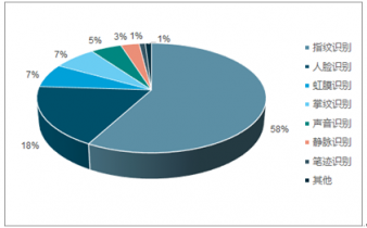在全球范圍內來看,指紋識別技術使用較為廣泛,指紋識別產品市場份額約為58%,其次是人臉識別產品(占比約18%)、掌紋識別產品(占比約7%)與虹膜識別產品(占比約7%)。