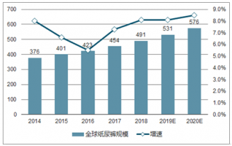 2014-2020E全球紙尿褲行業(yè)規(guī)模及增速(億美元)