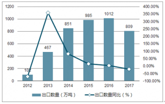 2012-2017年中國焦炭及半焦炭出口數量統(tǒng)計圖
