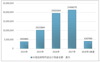2016年我國頭孢他啶制劑進出口貿易總額19553354美元,2017年進出口貿易總額21406270美元;2018年1季度進出口貿易總額4187990美元。