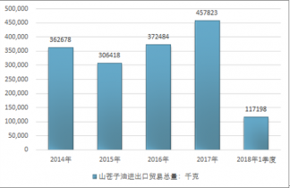2016年我國山蒼子油進出口貿易總量372484千克,2017年進出口貿易總量457823千克;2018年1季度進出口貿易總量117198千克。