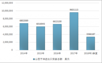 2016年我國山蒼子油進出口貿易總額6615100美元,2017年進出口貿易總額9601113美元;2018年1季度進出口貿易總額3366187美元。