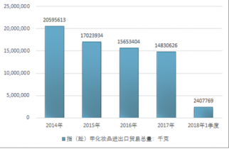 2016年我國指(趾)甲化妝品進(jìn)出口貿(mào)易總量15653404千克,2017年進(jìn)出口貿(mào)易總量14830626千克;2018年1季度進(jìn)出口貿(mào)易總量2407769千克。