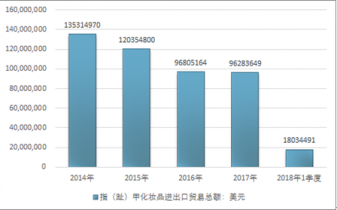 2016年我國指(趾)甲化妝品進(jìn)出口貿(mào)易總額96805164美元,2017年進(jìn)出口貿(mào)易總額96283649美元;2018年1季度進(jìn)出口貿(mào)易總額18034491美元。