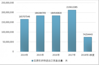 2016年我國亞麻機織物進出口貿易總量184540820米,2017年進出口貿易總量213612285米;2018年1季度進出口貿易總量74254443米。