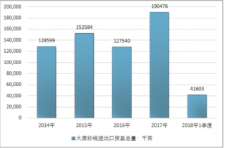 2016年我國大麻紗線進出口貿易總量127540千克,2017年進出口貿易總量190476千克;2018年1季度進出口貿易總量41603千克。