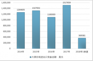 2016年我國大麻紗線進出口貿易總額1100303美元,2017年進出口貿易總額1517659美元;2018年1季度進出口貿易總額369381美元。