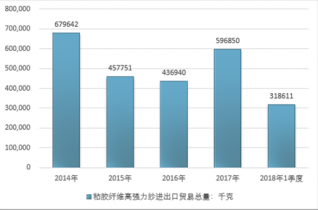 2016年我國粘膠纖維高強力紗進出口貿易總量436940千克,2017年進出口貿易總量596850千克;2018年1季度進出口貿易總量318611千克。
