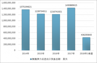 2016年我國聚酯彈力絲進出口貿易總額1216741921美元,2017年進出口貿易總額1430889615美元;2018年1季度進出口貿易總額436293643美元。