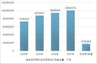 2016年我國合成纖維長絲絲束進出口貿易總量94365444千克,2017年進出口貿易總量100431715千克;2018年1季度進出口貿易總量17321919千克。