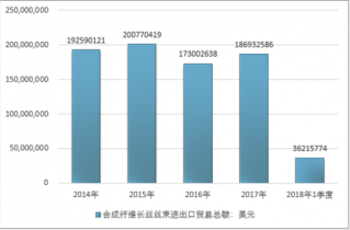 2016年我國合成纖維長絲絲束進出口貿易總額173002638美元,2017年進出口貿易總額186932586美元;2018年1季度進出口貿易總額36215774美元。
