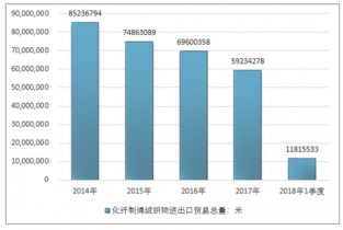 2016年我國化纖制繩絨織物進出口貿易總量69600358米,2017年進出口貿易總量59234278米;2018年1季度進出口貿易總量11815533米。