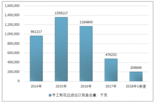 2016年我國手工制花邊進出口貿易總量1164843千克,2017年進出口貿易總量476232千克;2018年1季度進出口貿易總量204640千克。