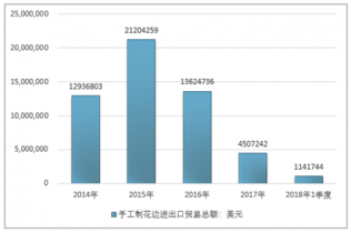 2016年我國手工制花邊進出口貿易總額13624736美元,2017年進出口貿易總額4507242美元;2018年1季度進出口貿易總額1141744美元。