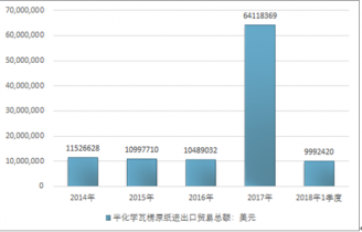 2016年我國半化學(xué)瓦楞原紙進出口貿(mào)易總額10489032美元,2017年進出口貿(mào)易總額64118369美元;2018年1季度進出口貿(mào)易總額9992420美元。