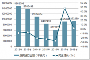 2012-2018年中國廢銅進口金額統(tǒng)計圖