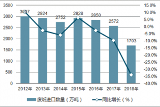 2018年1-12月中國廢紙進口數量為1703萬噸,同比下降33.8%;2018年1-12月中國廢紙進口金額為4292828千美元,同比下降26.9%。