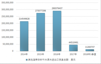 2016年我國其他溫帶非針葉木原木進出口貿(mào)易總額290379437美元,2017年進出口貿(mào)易總額44510491美元;2018年1季度進出口貿(mào)易總額11263737美元。