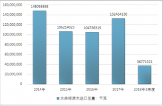 2016年我國水曲柳原木進(jìn)出口貿(mào)易總量104736319千克,2017年進(jìn)出口貿(mào)易總量132464230千克;2018年1季度進(jìn)出口貿(mào)易總量36771321千克。