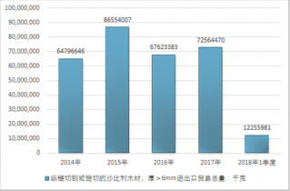 2016年我國縱鋸切刨或旋切的沙比利木材,厚>6mm進(jìn)出口貿(mào)易總量67623383千克,2017年進(jìn)出口貿(mào)易總量72564470千克;2018年1季度進(jìn)出口貿(mào)易總量12255981千克。