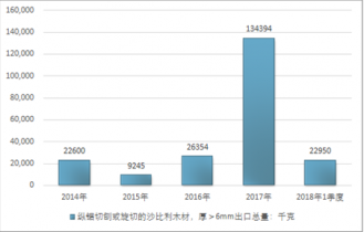 2016年我國縱鋸切刨或旋切的沙比利木材,厚>6mm進(jìn)出口貿(mào)易總額51410811美元,2017年進(jìn)出口貿(mào)易總額51130922美元;2018年1季度進(jìn)出口貿(mào)易總額9498892美元。