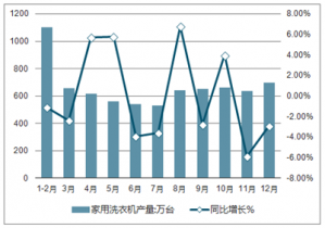 2019年各月中國(guó)家用洗衣機(jī)產(chǎn)量及增長(zhǎng)走勢(shì)