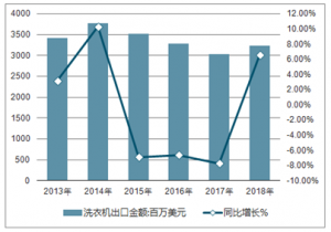 2013-2018年中國(guó)洗衣機(jī)出口金額及增長(zhǎng)走勢(shì)