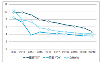 從整體上來看,2012-2017年增速高于男裝、女裝,保守估計(jì)2019年也是相同趨勢(shì)。