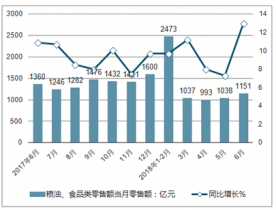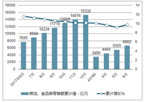 從糧油、食品類零售情況來看,2019年6月份糧油、食品類零售額達1151億元,與去年同期相比增長13%。2019年1-6月全國糧油、食品類累計零售額收入達6662億元,同比增長9.8%