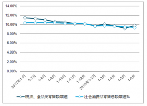 從增速來看,2019年1-6月全國糧油、食品類零售額同比增加9.8%,高于同期社會消費品零售總額增速0.4個百分點。