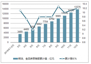 2018年1-12月全國糧油、食品類零售額同比增加10.2%,高于同期社會消費品零售總額增速1.2個百分點。
