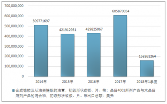 2016年我國合成橡膠及從油類提取的油膏,初級形狀或板、片、帶;品目4001所列產(chǎn)品與本品目所列產(chǎn)品的混合物,初級形狀或板、片、帶出口總額429825067美元,2017年出口總額605870054美元;2018年1季度出口總額158261264美元。