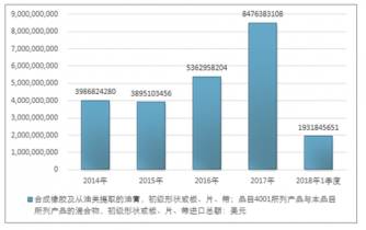 2016年我國合成橡膠及從油類提取的油膏,初級形狀或板、片、帶;品目4001所列產(chǎn)品與本品目所列產(chǎn)品的混合物,初級形狀或板、片、帶進(jìn)口總額5362958204美元,2017年進(jìn)口總額8476383108美元;2018年1季度進(jìn)口總額1931845651美元。