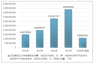 2016年我國合成橡膠及從油類提取的油膏,初級形狀或板、片、帶;品目4001所列產(chǎn)品與本品目所列產(chǎn)品的混合物,初級形狀或板、片、帶進(jìn)口總量3314917127千克,2017年進(jìn)口總量4363941862千克;2018年1季度進(jìn)口總量1093534531千克。