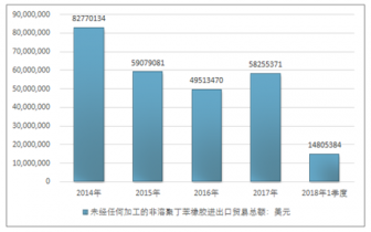 2016年我國未經任何加工的非溶聚丁苯橡膠進出口貿易總額49513470美元,2017年進出口貿易總額58255371美元;2018年1季度進出口貿易總額14805384美元。