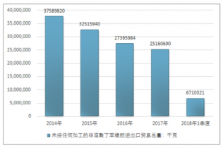 2016年我國未經任何加工的非溶聚丁苯橡膠進出口貿易總量27395984千克,2017年進出口貿易總量25160690千克;2018年1季度進出口貿易總量6710321千克。