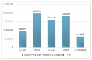 2016年我國初級形狀充油熱塑丁苯橡膠進出口貿易總量15921181千克,2017年進出口貿易總量18155018千克;2018年1季度進出口貿易總量6119832千克。