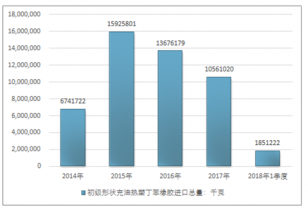 2016年我國初級形狀充油熱塑丁苯橡膠進口總量13676179千克,2017年進口總量10561020千克;2018年1季度進口總量1851222千克。