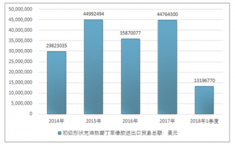 2016年我國初級形狀充油熱塑丁苯橡膠進出口貿易總額35870077美元,2017年進出口貿易總額44764300美元;2018年1季度進出口貿易總額13196770美元。