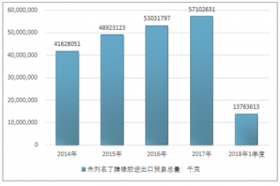 2016年我國未列名丁腈橡膠進出口貿(mào)易總額121447005美元,2017年進出口貿(mào)易總額171200095美元;2018年1季度進出口貿(mào)易總額41782326美元。