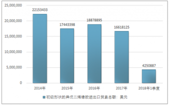 2016年我國初級形狀的異戊二烯橡膠進出口貿(mào)易總額18878895美元,2017年進出口貿(mào)易總額16618125美元;2018年1季度進出口貿(mào)易總額4250887美元。
