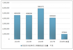 2016年我國初級形狀的異戊二烯橡膠進口總量5881572千克,2017年進口總量4095840千克;2018年1季度進口總量979944千克。