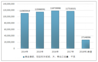 2016年我國再生橡膠,初級形狀或板、片、帶出口總量118739998千克,2017年出口總量117318101千克;2018年1季度出口總量27148096千克。
